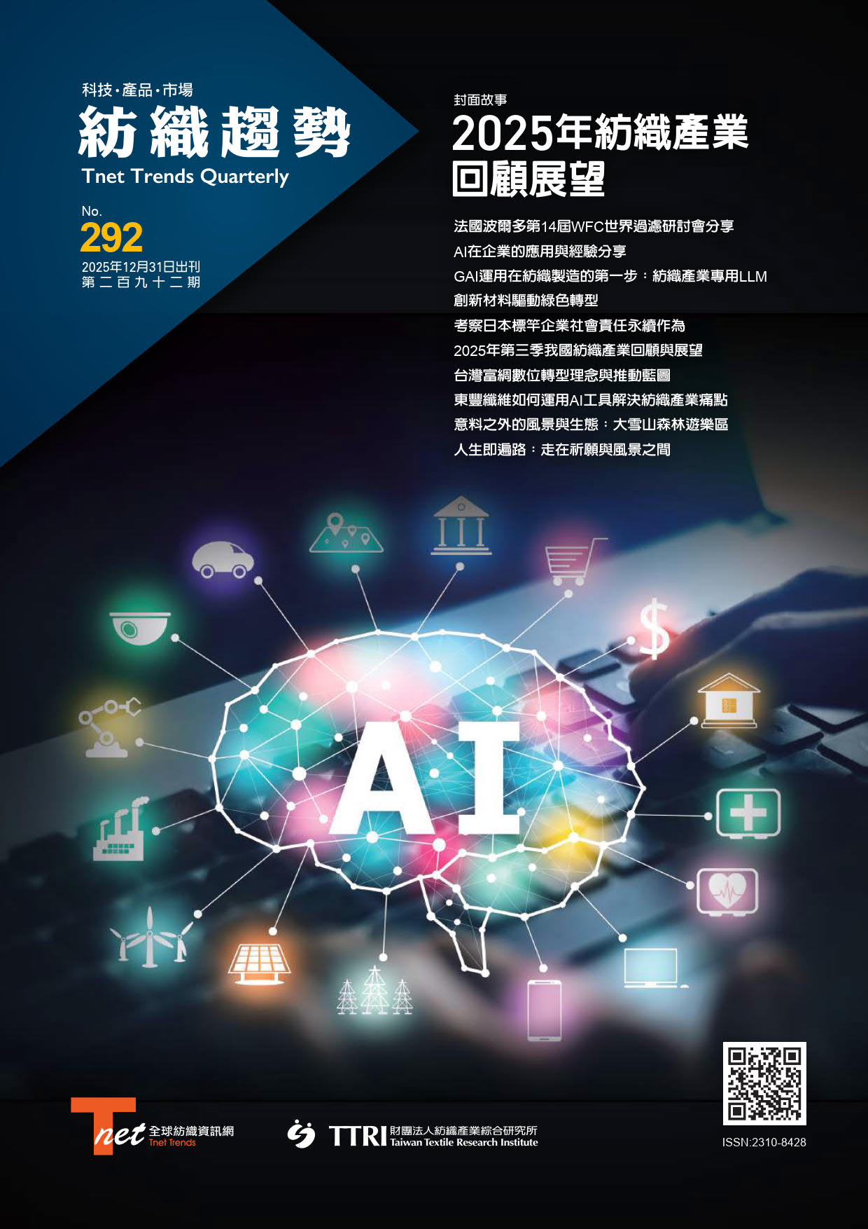時光荏苒,已到2024年中,世界各國不論是自 然或是政經環境,都是一日數變,而數位化、環保、新技術、滿足客戶個別需求,是許多產業致力發展的目標,亦是台灣紡織產業的轉型重點,透過各種包含AI在內的新研發技術與異業合作,重整紡織產業鏈。全球因新冠疫情,導致新消費型態出現,傳統消 費模式已然轉變且趨於成熟。對此全球紡織產業,包含時尚產業,都在努力加速朝智慧化、數位化發展,並導入遠端作業、自動化/ .... 繼續閱讀